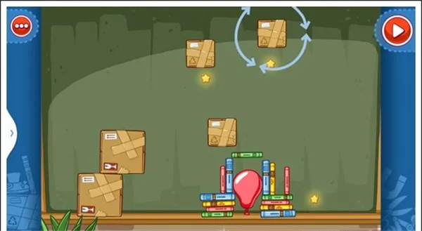 我们只需要将两个板凳放入图中所示位置,和一个气球放在那个书本底下,就可以让球滚下,获得星星。