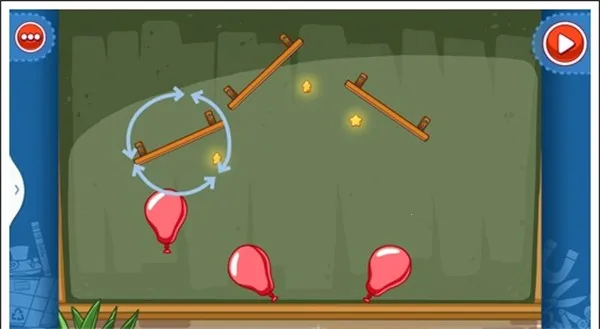 我们只需要将三个木板凳各自斜放在星星上头就可以让气球自由飞上去,获得星星。
