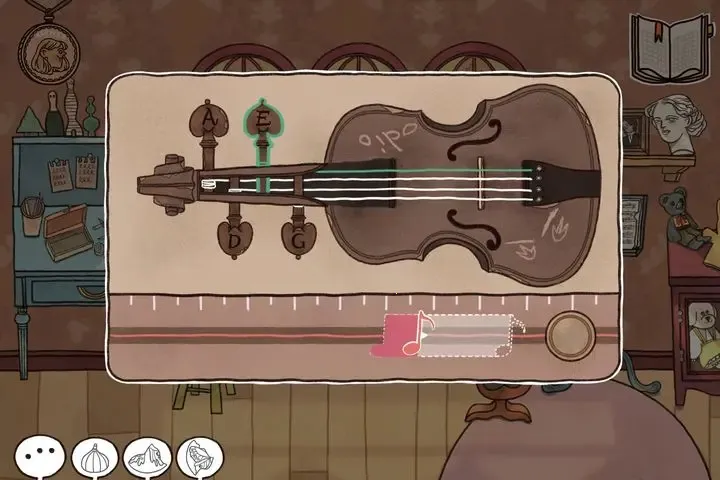 4、【女主1908】点击小提琴,游玩游戏,得到纸--在音符对准时点击右侧圆形按钮(可以在即将对齐时点击),如果有一长段表示按住不动,4根弦难度逐级增加,最后一段虚线音符也会移动