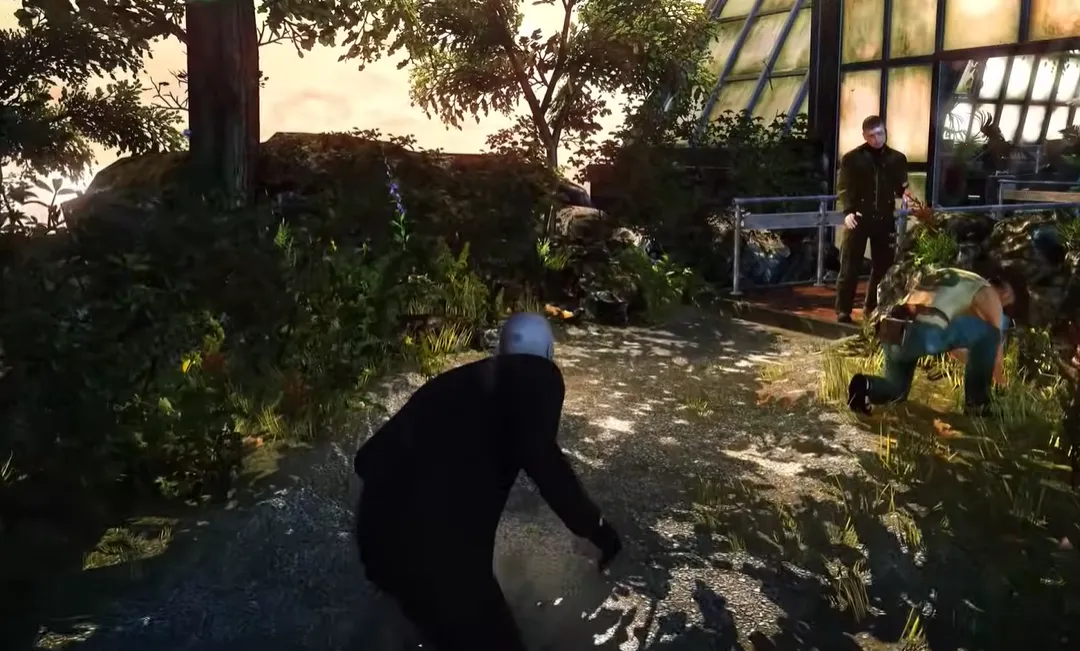 1、全新掩体系统:本作加入了全新的掩体系统,躲在树干后使用消音手枪解决第二名守卫,并把尸体藏进垃圾桶中,让玩家在潜行暗杀时更具策略性。